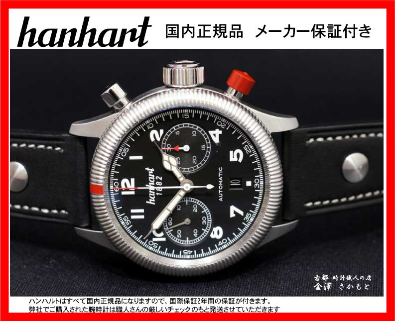 国内正規品【HANHART】ハンハルト ドイツ製「パイオニア」ツインコントロール 42mmケース 自動巻きクロノグラフ MADE IN GERMANY【721.210-001】ブラック文字盤 革ストラップ