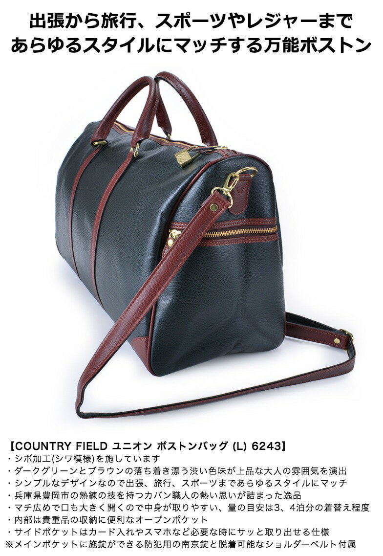 COUNTRY FIELD ユニオン ボストンバッグ (L) 6243 メイン素材: 合成皮革 留め具の種類: ファスナー 原産国:日本 サイズ:タテ29cmxヨコ50cmxマチ25cm 容量:36L ポケットの数:2 重量:780g ショルダーストラップ付き(脱着可能) 南京錠付き 【COUNTRY FIELD ユニオン ボストンバッグ (L) 6243】 シボ加工(シワ模様)を施しています ダークグリーンとブラウンの落ち着き漂う渋い色味が上品な大人の雰囲気を演出 シンプルなデザインなので出張、旅行、スポーツまであらゆるスタイルにマッチ 兵庫県豊岡市の熟練の技を持つカバン職人の熱い思いが詰まった逸品 マチ広めで口も大きく開くので中身が取りやすい、量の目安は3、4泊分の着替え程度 内部は貴重品の収納に便利なオープンポケット サイドポケットはカード入れやスマホなど必要な時にサッと取り出せる仕様 ※メインポケットに施錠ができる防犯用の南京錠と脱着可能なショルダーベルト付属商品番号:6243 ■COUNTRY FIELD ユニオン ボストンバッグ (L) 6243 日本製 豊岡鞄 ユニオン 紳士 人気 大容量 正規品 新品 軽量 斜め掛け おしゃれ ■ボストンバッグ メンズ 日本製 豊岡鞄 ユニオン 紳士 人気 大容量 正規品 新品 軽量 斜め掛け おしゃれ 旅行 サブバッグ 肩掛け シンプル メンズバッグ ギフト プレゼント 贈り物 誕生日 父の日 COUNTRY FIELD カントリーフィールド (6243)【送料無料】 ■対 象— ビジネスマン OL 大人 社会人 学生 就活生 大学生 メンズ 男性 紳士用 男子 レディース 女性 婦人用 ■用 途— ビジネス フォーマル プライベート 普段使い 日常使い 旅行 海外旅行 国内旅行 小旅行 修学旅行 卒業旅行 新婚旅行 宿泊 合宿 出張 研修 帰省 里帰り レジャー イベント スポーツ 避難 防災 通勤 クラブ 習い事 お稽古 ☆